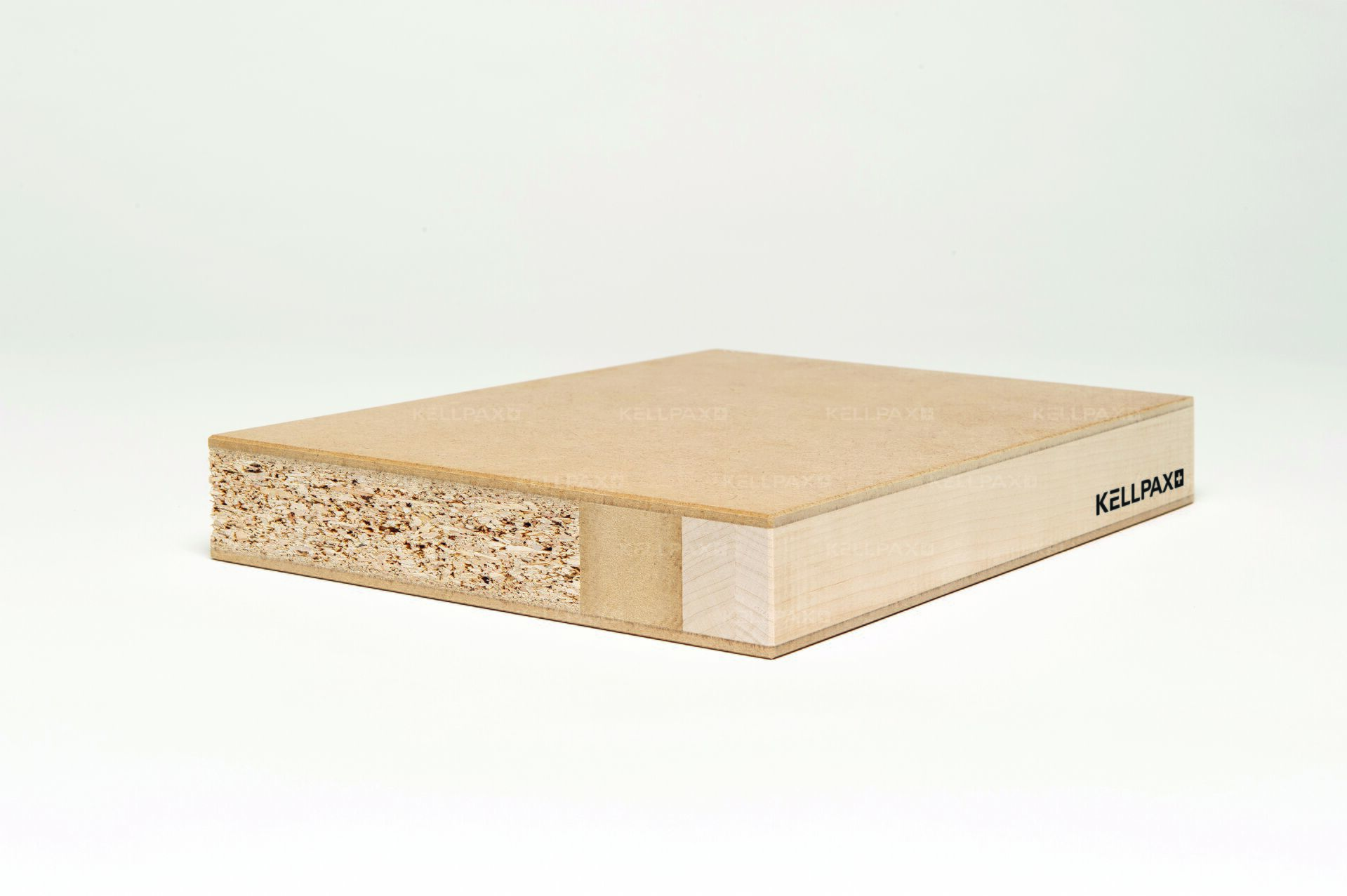 Mittellage flachgepresste Spanplatte, verstärkter Konstruktionsaufbau EI30, beidseitig abgesperrt mit Hartplattendeck, wahlweise mit Klimadeck. 4-seitig Kanten aus Birke (europäische Herkunft) als Einleimer.